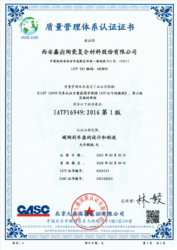 近日,西安鑫垚陶瓷復合材料股份有限公司收到了北京九鼎國聯(lián)認證有限公司下發(fā)的IATF 16949汽車質量管理體系認證證書,認證注冊范圍為“碳陶...